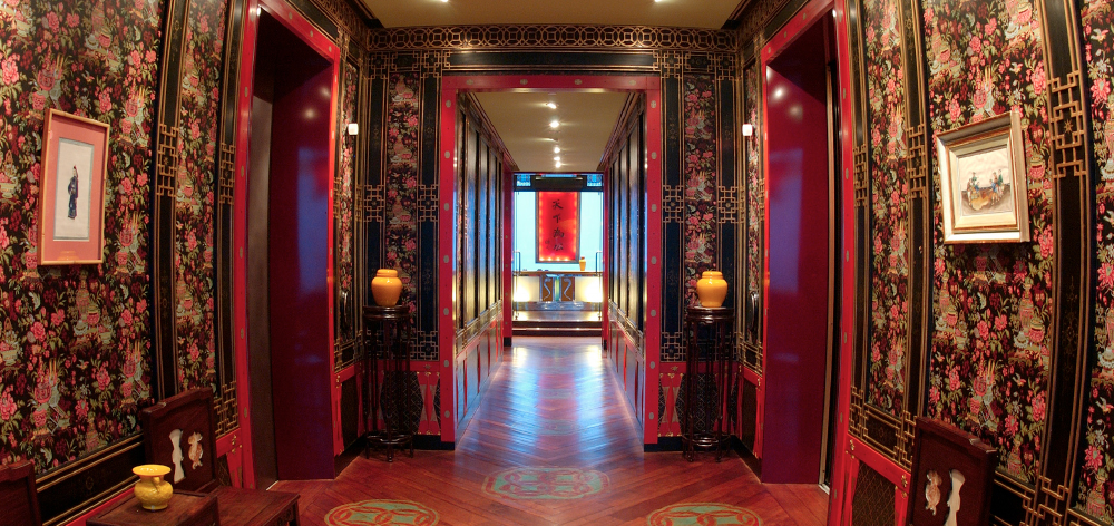The interior decoration is based on strong Chinese tradition. This juxtaposition of the new and old heighten the dramatic atmosphere of the club. Private dining rooms are surrounded by lattices of Chinese motifs and banquettes in deep and sumptuous fabrics; banquets are served in partitioned rooms with antique Chinese partitions folding back across the length of the atrium to allow maximum flexibility on space.